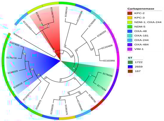 The phylogenetic analysis of carbapenem-producing E. coli. The phylogenetic analysis of E. coli. The cladogram depicts the relationships among isolates and follows the same schematics as in Figure 4.
