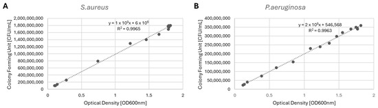 Relationship between the concentration of colony-forming units and optical density for S. aureus (A) and P. aeruginosa (B).