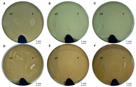 Agar diffusion tests on untreated (UT) and silver-treated (T) samples against antibiotic-resistant Pseudomonas aeruginosa (A–C) and Staphylococcus aureus (D–F) at different degradation time points, namely t = 0 (A,D), t = 1 day (B,E) and t = 3 days (C,F).