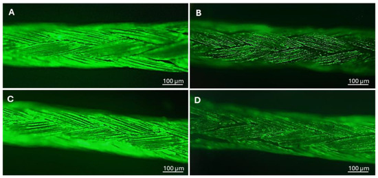 In order to evaluate the effect of the silver coating on biofilm formation, the samples were immersed in 6 mL of tryptic soy broth inoculated with each bacterial strain at an initial OD = 0.0005 and incubated at 37 °C under shaking conditions for 48 h. After incubation, the samples were washed with phosphate-buffered saline (PBS) to remove non-adherent bacterial cells and then dried at 37 °C for 1 h. Pseudomonas aeruginosa and Staphylococcus aureus biofilms matured on the surface of silver-treated and untreated sutures were observed using fluorescence microscopy. The biofilms were stained using a green fluorescent nucleic acid stain at a concentration of 3 µL (SYTO9; Molecular Probes, Waltham, MA, USA). After incubation for 15 min in the dark, the samples were washed with PBS, dried at 37 °C and observed with a fluorescence microscope at 10× (Axio Vert A1 Zeiss).