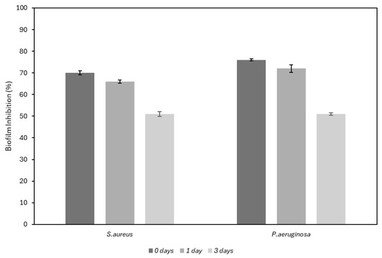 A quantitative evaluation of the biofilm was also performed through the Crystal Violet assay. Figure 5 reports the percentages of biofilm inhibition calculated for both bacterial strains at different time points in comparison with the untreated samples.