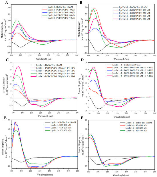 CD spectra of (A,C,E) LyeTx I and (B,D,F) LyeTx I-b in the presence of (A,B) POPC/POPG (3:1, mol/mol) and (C,D) POPC/POPG (3:1, mol/mol) + 1% PEGylated POPE (pH 8.0, 20 mM Tris buffer) phospholipid vesicles, as well as in (E,F) in the presence of SDS micelles.