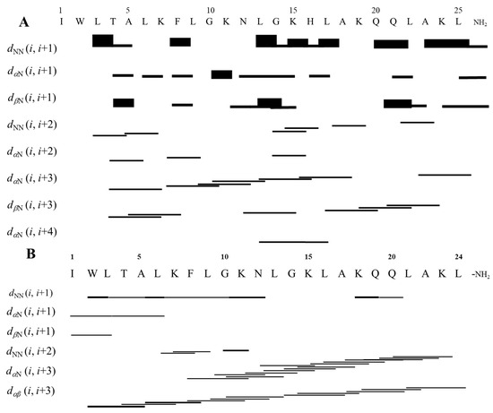 The assignments of intra-residual and inter-residual correlations were performed through joint analysis of homonuclear TOCSY and NOESY spectra. Using the Wüthrich method and the reference values from the Biological Magnetic Resonance Data Bank chemical shift table (available at https://bmrb.io/ref_info/csstats.php, accessed on 16 January 2024), the corresponding spin system for each amino acid residue was identified based on the respective sequential inter-residue correlations [12]. The NOESY spectra contain dNN(i, i + 1) correlations involving practically all of the residues within the peptide backbone as well as some dNN(i, i + 2) correlations. Additionally, the dαβ(i, i + 3) region, also characteristic of helical structures, is observed. In summary, the high occurrence of dNN(i, i + 1), dαN(i, i + 3), dαβ(i, i + 3), and dαN(i, i + 4) NOE correlations characteristic of a-helical peptides (Figure 2) is in line with the results obtained from CD spectroscopy. In fact, some dNN(i, i + 2) correlations have already been described for LyeTx I-b in aqueous TFE, which were related to the curvature of the peptide helix [2]. Such NOEs were also observed for LyeTx I but to a lesser extent. The NOE intensities and the chemical shift data were converted into geometric restraints, which were used in simulated annealing protocols to obtain the three-dimensional structures of the peptides. As shown in Figure 3, both structures are characterized by a dominant helical segment ranging from Leu-3 to Gln-20 for LyeTx I and from Trp-2 to Lys-23 for LyeTx I-b. The Ramachandran plots (Figure S2) confirm the high stereochemical quality of the 10 lowest-energy structures as >98.0% of the amino acid residues are located in the most favored regions.