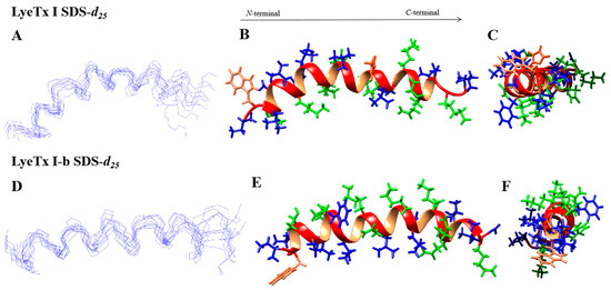 NMR three-dimensional structures of (A–C) LyeTx I and (D–F) LyeTx I-b in the presence of 200 mM SDS-d25 micelles. (A,D) Superposition of the 10 lowest-energy structures. (B,E) Horizontal and (C,F) frontal perspectives of the most stable peptide structure. (C) LyeTx I and (F) LyeTx I-b structure with the front view of the helix. In (B,C,E,F), the hydrophilic residues are shown in green, hydrophobic residues in dark blue, and the Trp residue in orange. The N-terminals are shown in the front in (E,F) and on the left in (B,E).