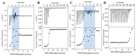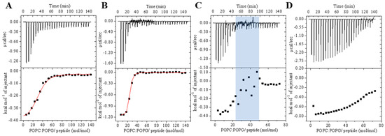Isothermal titration calorimetric curves obtained from the titration of 20 mM POPC/POPG (3:1, mol/mol) vesicles into Tris-HCl buffer pH 8.0 peptide solutions at 25 °C: (A) 50 μM LyeTx I; (B) 50 μM LyeTx I-b; (C) 100 μM LyeTx I; and (D) 100 μM LyeTx I-b. In the panels, the blue shading highlights the molar ratio, while the red line on the curves represents the fitting.