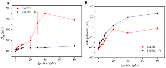 The addition of peptide results in increases in both vesicle size and zeta potential (Figure 7). LyeTx I shows a substantially greater increase in the hydrodynamic diameter from 20 μM peptide (Dh ≅ 200 nm), reaching a maximum at 40 μM LyeTx I (Dh ≅ 450 nm) with polydispersity index (PDI) values of 0.3, indicating a heterogeneous size distribution [17]. Higher size populations are identified in the graphic distributions (Figure S4), indicating a process of vesicle aggregation/agglutination. On the other hand, the LyeTx I-b peptide causes a regular increase in the LUVs average diameter, reaching a plateau at 5 μM (Dh ≅ 122 nm). In addition, the polydispersity index (PDI) values remain below 0.3, even at higher peptide concentrations. Consequently, a single-size distribution centered at 125 nm is noted for the LUVs in the presence of 80 μM LyeTx I-b (Figure 7B). Interestingly, the interaction of LyeTx I-b causes a greater increase in the ζ potential, especially at peptide concentrations ≥ 40 μM. At the highest concentrations (80 μM), LyeTx I does not achieve charge neutrality and maintains a negative surface. In contrast, LyeTx I-b, despite having a similar charge, is able to neutralize the vesicles in the system, reaching neutrality and making the vesicles positively charged at concentrations above 20 μM.