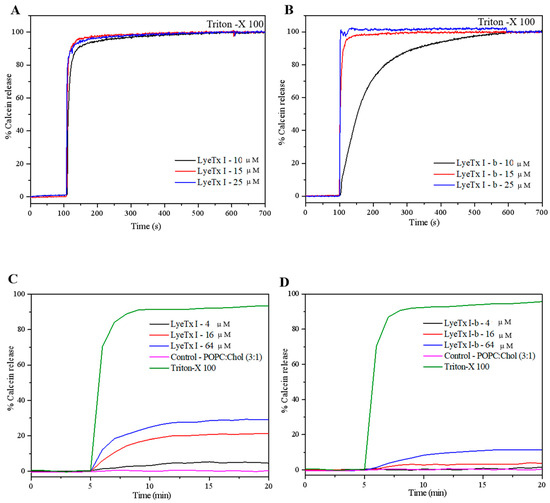Kinetics of calcein release from (A,B) POPC/POPG (3:1, mol/mol) and (C,D) POPC/Chol LUVs induced by different concentrations of (A,C) LyeTx I and (B,D) LyeTx I-b.