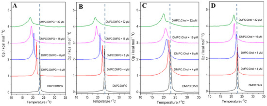 DSC profile of the gel-to-liquid-crystalline phase transition of 3.0 mM (A,B) DMPC/DMPG and (C,D) DMPC/Chol in the presence of (A,C) LyeTx I and (B,D) LyeTx I-b at different concentrations. Dash grey lines indicate the Tm of the LUVs in the absence of peptides.
