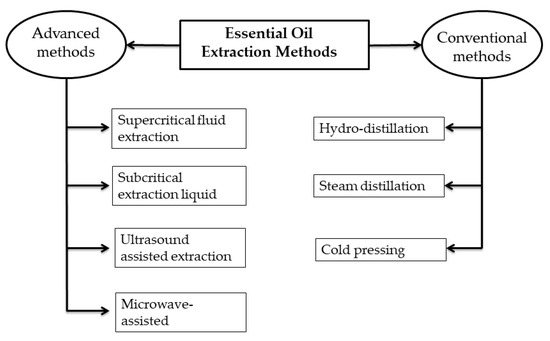 According to the European Pharmacopeia (seventh edition) [121], EOs are “aromatic products consisting of a mixture of compounds extracted from plant raw material, either through dry distillation, steam distillation, or by an appropriate mechanical technique without heating”. Herbal and medicinal plants hold significant importance since a large portion of the population relies on their products, such as EOs. These plant-derived products are utilized in various industries, including medicine, food, and cosmetics [122]. A variety of extraction techniques are employed to obtain EOs from different parts of plant species, including flowers, buds, barks, peels, leaves, and seeds [123]. The techniques used to extract EOs from these plants include steam distillation, solvent-assisted extraction, hydrodistillation, ultrasonic-assisted extraction, supercritical fluid extraction, and solvent-free microwave extraction. Figure 2 provides an overview of the classification of conventional and advanced oil extraction techniques. The choice of an appropriate extraction method for extracting EOs depends on the plant species. Each plant species or plant part has a recommended standard distillation method, such as hydrodistillation, steam distillation, or dry distillation [124]. It is essential to emphasize that the composition of EO is significantly affected by the plant variety, the location where it is grown (including climate and environmental conditions, any stress endured, etc.), and the type of nutrition and fertilizers applied [125].
