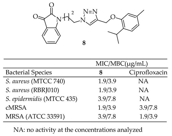Chemical structure of compound 8 and its antibacterial outcomes [140].