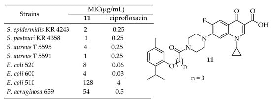 Szostek et al. [142] successfully synthesized sixteen new ciprofloxacin-containing thymol or menthol and evaluated their activity against Gram-negative and Gram-positive bacterial strains, as shown in Figure 6. The compounds exhibited similar potency against E. coli 520 and 600, with MIC values ranging from 4 to 64 µg/mL. For Gram-positive hospital microorganisms, all tested derivatives were active, with MIC values between 1 and 16 µg/mL, indicating high antimicrobial potency. Compound 11 (Figure 6) emerged as the leading structure, with MICs of 1 µg/mL against S. pasteuri KR 4358 and S. aureus T 5591 (clinical strains). Interestingly, no trends were observed in relation to the linkers used (ranging from acetyl to hexyl). The best results were obtained for compound 11 from the thymol group, which contained a butyl linker. This study revealed poor outcomes for disubstituted derivatives, indicating that the 3-oxo-4-carboxylic acid core is the active DNA gyrase-binding site. Structural modifications to this fragment were associated with a decrease in antibacterial efficacy.