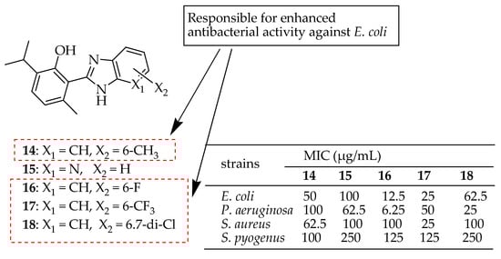 Bhoi et al. [144] developed a series of benzimidazole derivatives derived from the naturally occurring phenolic monoterpenoid thymol, utilizing a green synthesis approach. These derivatives were evaluated for their antibacterial activity against Escherichia coli, P. aeruginosa, S. aureus, and S. pyogenes. Among these derivatives, compounds 14–18 in Figure 8 demonstrated significant antibacterial activity against the E. coli strain. Compounds 15–18 showed potent antibacterial activity against the P. aeruginosa strain. Compounds 14 and 17 exhibited considerable antibacterial activity against the S. aureus strain. The in silico analysis of ADME characteristics for the synthesized compounds suggested they would make excellent drugs with high oral bioavailability. According to the SAR analysis, the alkyl, chloro, and fluoroalkyl groups (in compounds 14 and 16–18) were responsible for enhanced antibacterial activity against E. coli. The benzimidazole core, when featuring alkyl and fluoroalkyl groups (14 and 17) at the sixth position, demonstrated increased antibacterial activity against S. aureus.