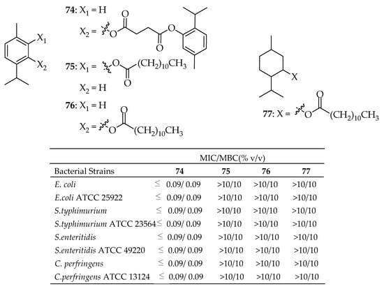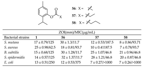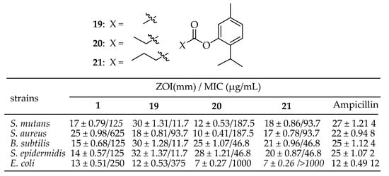 Mathela et al. [145] synthesized and characterized fourteen esters of thymol and carvacrol using spectral data. The antibacterial activity of thymol, carvacrol, and their esters against four Gram-positive bacteria (S. mutans MTCC 890, S. aureus MTCC 96, B. subtilis MTCC 121, and S. epidermidis MTCC 435) and one Gram-negative bacterium (E. coli MTCC 723) was studied. The thymol ester derivatives 19–21 in Figure 9 showed increased activity against S. mutans, B. subtilis, and S. epidermidis compared to thymol, while the carvacrol derivatives exhibited significantly less activity than carvacrol.
