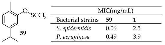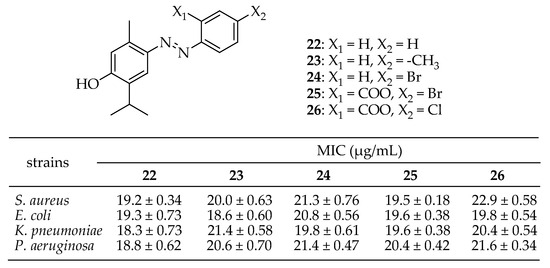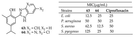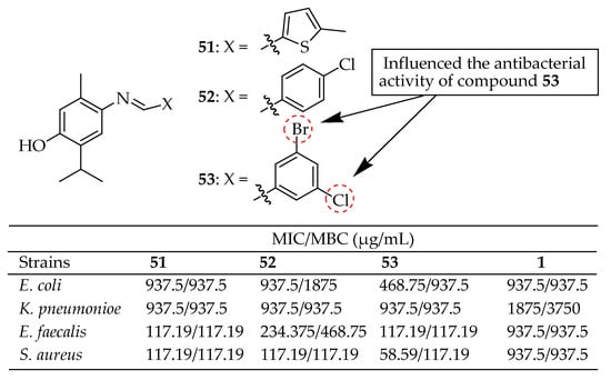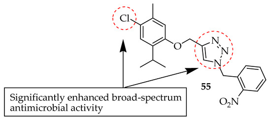 Bishoyi et al. [141] synthesized thymol Mannich-base derivatives and evaluated their antibacterial activity against uropathogenic bacteria, S. aureus, S. pyogenes, and E. coli. Among these, compound 9 (depicted in Figure 5) exhibited significant antibacterial activity. Specifically, it showed the notable inhibition of E. coli and S. aureus with MICs of 3.12 μg/mL and 12.5 μg/mL, respectively. Another compound, 10 in Figure 5, exhibited effective inhibition against E. coli and S. aureus with MICs of 6.25 μg/mL. The SARs of these derivatives indicated that phenolic thymol structures with simple aminomethyl substitutions exhibited a favorable moderate antimicrobial effect.