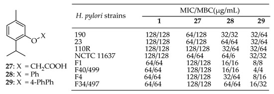 - Sisto, F.; Carradori, S.; Guglielmi, P.; Spano, M.; Secci, D.; Granese, A.; Sobolev, A.P.; Grande, R.; Campestre, C.; Di Marcantonio, M.C.; et al. Synthesis and Evaluation of Thymol-Based Synthetic Derivatives as Dual-Action Inhibitors against Different Strains of H. Pylori and AGS Cell Line. Molecules 2021, 26, 1829. [Google Scholar] [CrossRef] [PubMed]
