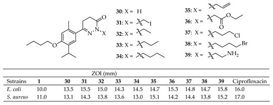 - Nagle, P.; Pawar, Y.; Sonawane, A.; Bhosale, S.; More, D. Docking Simulation, Synthesis and Biological Evaluation of Novel Pyridazinone Containing Thymol as Potential Antimicrobial Agents. Med. Chem. Res. 2014, 23, 918–926. [Google Scholar] [CrossRef]