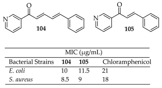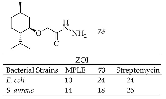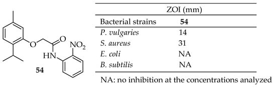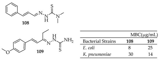 Chemical structures of compounds (9 and 10) and their antibacterial outcomes [141].