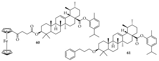 - Khwaza, V.; Oyedeji, O.O.; Oselusi, S.O.; Morifi, E.; Nwamadi, M.; Tantoh Ndinteh, D.; Ramushu, P.; Matsebatlela, T.; Aderibigbe, B.A. Synthesis of ester-linked ursolic acid-based hybrid compounds: Potential antibacterial and anticancer agents. Chem. Biodivers. 2023, 20, e202300034. [Google Scholar] [CrossRef] [PubMed]