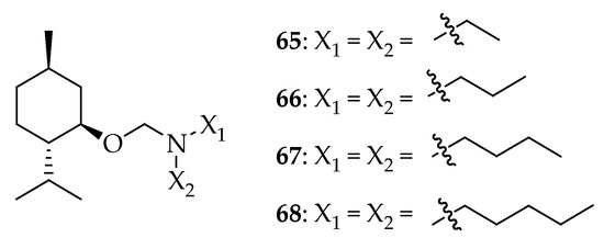 - Ismailova, S.V.; Mammadbeyli, E.H.; Gurbanov, A.I.; Muradova, S.A. Synthesis and properties of chiral dialkylaminomethoxy derivatives of L-(-)-menthol. PPOR 2019, 20, 168–176. [Google Scholar]
