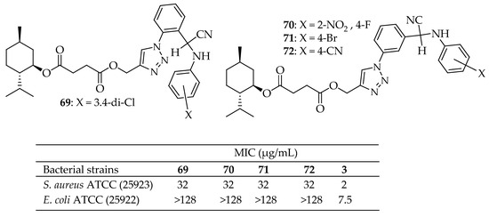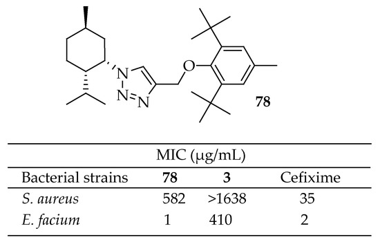 - Karbasi, M.; Salehi, P.; Aliahmadi, A.; Bararjanian, M.; Zandi, F. Synthesis of novel menthol derivatives containing 1,2,3-triazole group and their in vitro antibacterial activities. J. Serbian Chem. Soc. 2023, 88, 577–587. [Google Scholar] [CrossRef]