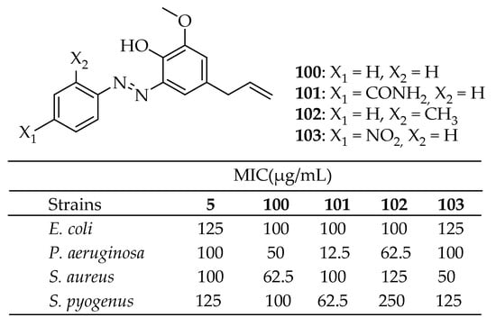 - da Silva, F.F.M.; Monte, F.J.Q.; de Lemos, T.L.G.; Do Nascimento, P.G.G.; de Medeiros Costa, A.K.; de Paiva, L.M.M. Eugenol derivatives: Synthesis, characterization, and evaluation of antibacterial and antioxidant activities. Chem. Cent. J. 2018, 12, 34. [Google Scholar] [CrossRef]