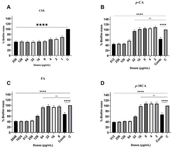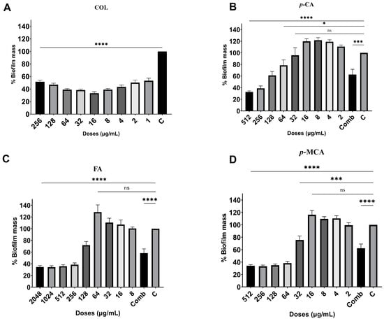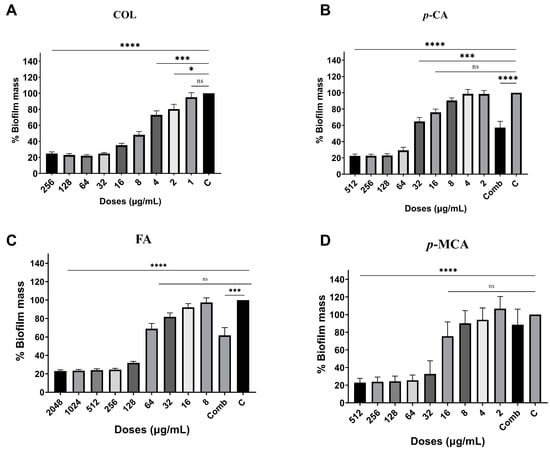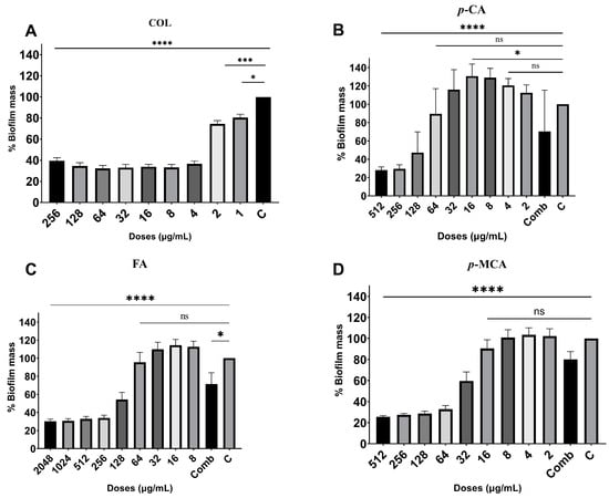 Antibiofilm activities of COL (A), p-CA (B), FA (C), and p-MCA (D) against COLR-Ab1 isolate. * p ≤ 0.05, *** p ≤ 0.001, and **** p ≤ 0.0001 were considered to indicate statistically significant differences compared to the growth control group. ns: not significant (p > 0.05); C, control; Comb, combination.