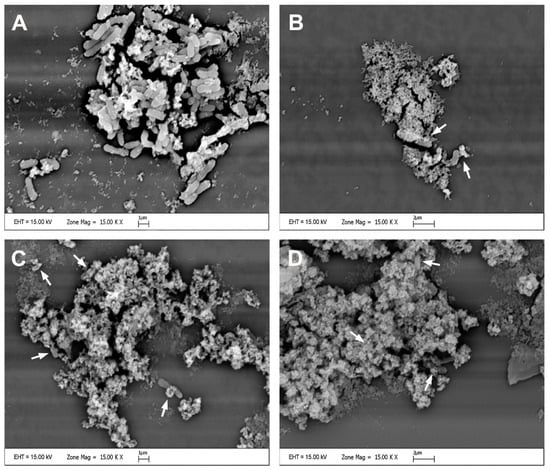 Scanning electron micrographs of the COLR-Ab4 isolate in the presence of MIC concentrations of p-CA, FA, and p-MCA: (A) untreated; (B) treated with p-CA; (C) treated with FA; (D) treated with p-MCA. White arrows indicate damaged bacterial cells. Scale bars, 1 µm in (A,C) and 2 µm in (B,D).