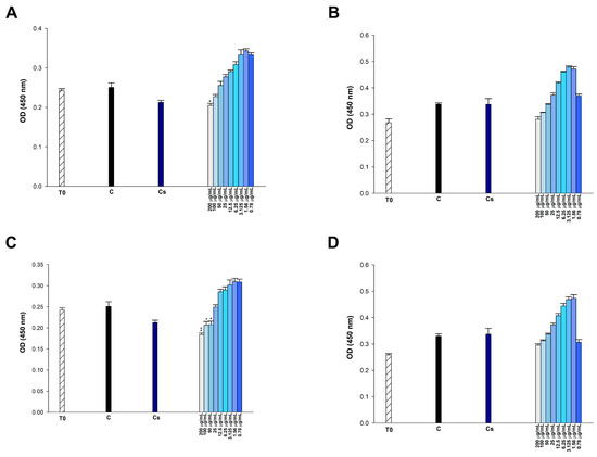 The checkerboard synergy test, based on microdilution, was carried out to investigate the combined activity of antibiotic and cinnamic acid derivatives. The effectiveness of the two antimicrobial drugs in combination was evaluated using a 96-well microplate for each strain. The medium employed was CAMHB. The combination of the two agents was examined within the dilution range of 2 × MIC and 0.0625 × MIC. COL was added vertically, and cinnamic acids was added horizontally to the wells. The bacterial suspension was prepared to 0.5 McFarland standard density, and the final bacterial concentration was adjusted to 5 × 105 CFU/mL. In total, 10 µL of bacterial inoculum was added to each well. Bacterial growth control (CAMHB + bacteria) and medium sterility control (CAMHB) were also examined for each plate. The plates were incubated at 35 ± 2 °C for 18–24 h. Each experiment was conducted in triplicate.