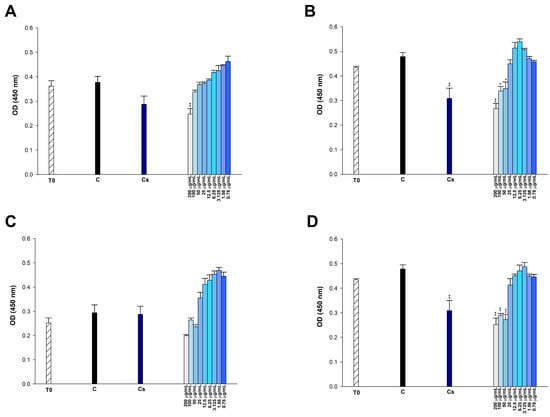 COL was obtained from Sigma-Aldrich (St. Louis, MO, USA), while p-CA, FA, and p-MSA were obtained from BostonChem (Boston, MA, USA). Stock solutions of 512 µg/mL for COL were prepared and stored at −20 °C. Stock solutions of 1024 µg/mL for p-CA and p-MCA and 4096 µg/mL for FA were prepared using pure ethanol and stored at −20 °C.
