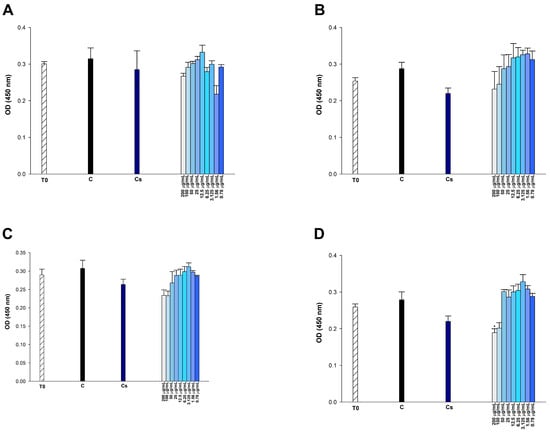 The antibiofilm activities of COL, p-CA, FA, and p-MCA against COLR-Ab isolates were determined by microtiter plate-based CV technique. The COLR-Ab2 isolate was not included in this study as it exhibited weak biofilm formation. The results show that all COL doses inhibited biofilm formation by approximately 19.7–75.2%, with the exception of the 1 μg/mL dose for COLR-Ab4 isolate. p-CA exerted a strong inhibitory effect by reducing biofilm formation of COLR-Ab isolates by 37.3–77.5% in the dose range of 512–32 μg/mL. However, at doses of 16–8 μg/mL of p-CA, a 20% increase in biofilm formation of COLR-Ab3 isolate was observed. FA showed significant antibiofilm activity in the dose range of 2048–128 μg/mL and inhibited biofilm formation by 28.1–77%. Finally, p-MCA was also able to reduce the biofilm formation of all isolates by 40.3–77.2% in the dose range 512–32 µg/mL. When the antibiofilm activities of the combinations were evaluated, it was determined that p-CA + COL inhibited biofilms by 29.7–42.7% in all isolates except COLR-Ab3 isolate. FA + COL successfully reduced biofilm formation at rates ranging from 28% to 41% for all isolates. p-MCA + COL exhibited effective biofilm inhibition only in COLR-Ab1 and COLR-Ab3 isolates with 41.7% and 32.8%, respectively. The antibiofilm activities of all agents against COLR-Ab isolates are presented in Figure 2, Figure 3, Figure 4 and Figure 5.