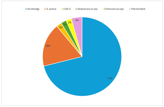 The causative microorganisms were isolated in only a minority of patients (13/45, 28.9%): six methicillin-resistant Staphylococcus aureus (MRSA), two methicillin-susceptible S. aureus (MSSA), one methicillin-resistant S. epidermidis (MRSE), one Streptococcus spp., one Enterococcus faecalis and two polymicrobial (MSSA + Pseudomonas aeruginosa, MSSA + Proteus mirabilis) (Figure 1).