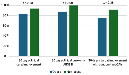 The median BMI in obese patients was 35 (31.5–36.7), while in non-obese patients, it was 24 (22.5–25.5) (p < 0.0001). ABSSSI alone (without concomitant OAIs, n = 17) was more common in obese than non-obese patients (8/12, 66.7% vs. 9/33, 27.3%, p = 0.03). Diabetes was more common in obese than non-obese patients (5/12, 41.7% vs. 3/33, 9.1%, p = 0.02). Median inflammatory values (CRP, WBC) and fever were similar between the two groups. A previous antibiotic therapy was administered for 20 (11.7–28) and 20 (12–28) days in obese and non-obese patients, respectively (p = 0.97). Likewise, no difference was observed for the mean number of DAL administrations (1.41 vs. 1.97 in obese and non-obese patients, respectively, p = 0.16). The primary reason for DAL use was to favor hospital discharge, with a slightly lower proportion in obese patients (10/12, 83.3%) compared to non-obese patients (32/33, 96.9%), while DAL use due to failure of other regimens was more common in obese patients (1/12, 16.6% vs. 2/33, 3.03%), though these differences are not statistically significant (p = 0.16). No differences were observed between the two groups for the modality of DAL administration [1 (8.3%), 7 (58.3%), 5 (41.6%) vs. 1 (3.1%), 23 (68.7%), 8 (24.2%) as the first, second or third therapeutic choice, respectively (p = 0.46, p = 0.72, p = 0.28, respectively)]. A similar length of hospitalization was observed in the two groups (22.5 ± 16.7 vs. 24.8 ± 14.1 days in obese and non-obese subjects, respectively). Clinical cure/improvement at 7 and 14 days was similar between the two groups: 5/12 (41.6%) vs. 18/33 (54.5%) (p = 0.51) and 11/12 (91.6%) vs. 30/33 (90.9%) (p > 0.99) in obese and non-obese patients, respectively. Clinical improvement in cases with OAIs at 7 and 14 days was similar between the two groups: 1/4 (25%) vs. 12/24 (50%) (p = 0.60) and 4/4 (100%) vs. 21/24 (87.5%) (p > 0.99) in obese and non-obese patients, respectively. At 30-day follow-up, clinical cure/improvement was slightly higher in non-obese than obese patients [31/33 (93.9%) vs. 10/12 (83.3%), p = 0.28]. After stratifying for diagnosis, clinical resolution at 30 d was 7/8 (87.5%) and 9/9 (100%) in obese and non-obese patients with ABSSSIs alone, respectively (p >0.99); when a concomitant OAI was present, clinical improvement was slightly lower in obese (3/4, 75%) than in non-obese patients (22/24, 91.7%), although this was not statistically significant (p = 0.38) (Figure 2). Clinical relapse was higher in obese than non-obese patients (2, 16.7% vs. 2, 6%, p = 0.28).