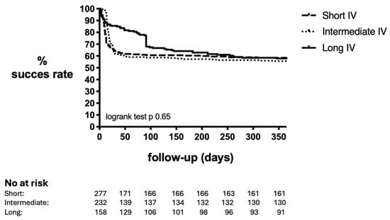 Overall, 285 patients (42.7%) in our study had treatment failure 1 year after DAIR. From the failures, 239 patients (84%) failed during antibiotic treatment (i.e., within 90 days after DAIR) and 46 patients (16%) failed after finishing antibiotic treatment. The most common endpoint of failure was the need for a second unintended DAIR in 173 patients (60.7%), followed by implant removal in 79 patients (27.7%), long-term antibiotic suppressive therapy in 22 patients (7.7%), and PJI-related death in 11 patients (3.9%). A longer duration of IV treatment was not associated with a higher success rate. The overall 1-year failure rate within the short, intermediate, and long IV groups was 41.5%, 44.4%, and 42.1%, respectively (p = 0.80) (Table 2, Figure 1). Patients in the short IV group had a failure rate of 33.3% (39/117) when treated with IV for shorter than 7 days as opposed to 47.5% (76/160) when treated between 7 and 14 days (p = 0.018). We additionally analyzed failure defined as implant removal during a 1-year follow-up period. Implant removal amongst the 3 groups was 19.5%, 15.9%, and 15.7%, respectively (p = 0.47).
