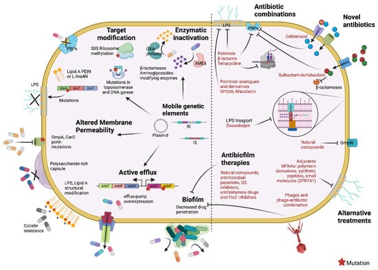 Acinetobacter baumannii resistance mechanisms, mobile genetic elements (left), and therapies (right). Abbreviations: adeABC and adeSR—Efflux pump genes and regulators: outer membrane protein (adeC), multidrug transporter (adeB) and membrane fusion protein (adeA), sensor kinase (adeS) and responsive regulator (adeR); AMEs—aminoglycoside-modifying enzymes; CarO—carbapenem resistance-associated outer membrane protein; IS—Insertion sequence; L-Ara4N—4-amino-4-deoxy-L-arabinose; LPS—lipopolysaccharide; lpxACD—genes codifying lipid A biosynthetic proteins; MPAAs—membrane perturbing antibiotic adjuvants; OXA type proteins—carbapenemases; OmpA—outer membrane protein A; OmpW—outer membrane protein W; PBPs—penicillin-binding proteins; PEtN—phosphoethanolamine; QS—quorum sensing; RI—Resistance islands. Created in https://BioRender.com, accessed on 7 January 2025.