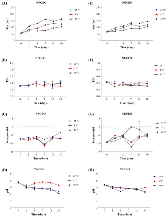 Effects of temperature (4, 25, and 40 °C) and storage time (0, 1, 3, 7, 14, and 30 days) on stability of nanoemulsions of P. guajava and E. uniflora. (A–D) = stability of nanoemulsion of P. guajava essential oil (NPGEO), (A)-nanoemulsion size (nm), (B)-polydispersity index (PDI), (C)-zeta potential, and (D)-pH. (E–H) = stability of nanoemulsion of E. uniflora essential oil (NEUEO), (E)-nanoemulsion size (nm), (F)-polydispersity index (PDI), (G)-zeta potential, and (H)-pH. Results are expressed as mean and standard deviation.