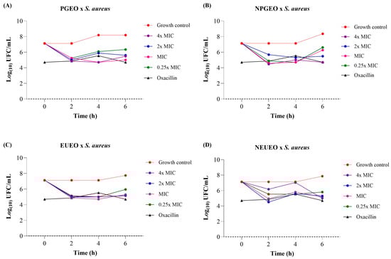 Time–growth inhibition assay of S. aureus for different concentrations of (A) P. guajava essential oil (PGEO), (B) P. guajava nanoemulsion (NPGEO), (C) E. uniflora essential oil (EUEO), and (D) E. uniflora nanoemulsion (NEUEO). Based on the MIC determined for the essential oil and nanoemulsion, the tested concentrations were defined as 4 × MIC, 2 × MIC, MIC, and 0.25 × MIC. The control growth corresponds to positive microbial growth, and the MIC of oxacillin was used as a growth inhibition control.