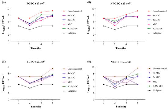 Time–growth inhibition assay of E. coli for different concentrations of (A) P. guajava essential oil (PGEO), (B) P. guajava nanoemulsion (NPGEO), (C) E. uniflora essential oil (EUEO), and (D) E. uniflora nanoemulsion (NEUEO). Based on the MIC determined for the essential oil and nanoemulsion, the tested concentrations were defined as 4 × MIC, 2 × MIC, MIC, and 0.25 × MIC. The control growth corresponds to positive microbial growth, and the MIC of cefepime was used as a growth inhibition control.