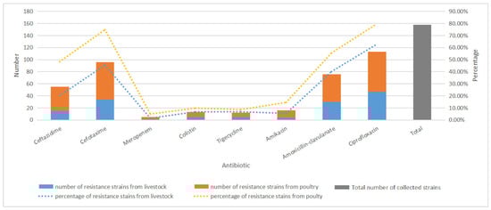 A total of 158 non-duplicate E. coli strains were collected, which were isolated and identified from the liver or brain of veterinary hospital cases. A total of 75 and 83 E. coli strains were isolated from livestock farms and poultry farms, respectively.