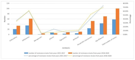 In general, 58 E. coli strains were isolated from 2015 to 2017 and 100 E. coli strains were isolated from 2018 to 2020. By comparing years 2015–2017 and years 2018–2020, the prevalence of β-lactams-, NDM (New Delhi metallo-β-lactamase)-, colistin-, tigecycline-, ceftazidime-, amikacin-, amoxicillin-clavulanate-, and ciprofloxacin-resistant E. coli isolates were 60.34% (35/58) and 61.00% (61/100), 1.72% (1/58) and 4.00% (4/100), 13.79% (8/58) and 5% (5/100), 5.17% (3/58) and 9.00% (9/100), 36.21% (21/58) and 34% (34/100), 8.62% (5/58) and 11.00% (11/100), 41.38% (24/58) and 52.00% (52/100), and 74.14% (43/58) and 70.00% (70/100), respectively. Finally, the resistance rates of E. coli strains to meropenem, tigecycline, amikacin, and amoxicillin-clavulanate increased during 2018–2020 compared with 2015–2017, while resistance rates to ceftazidime and colistin decreased (Figure 2).