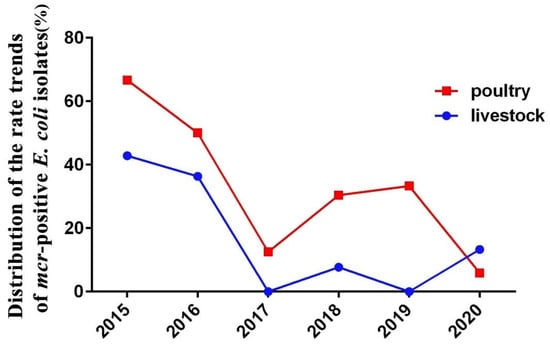 Shandong Province is one of the most developed provinces of livestock and poultry breeding in China, and the safety of livestock and poultry production is closely related to national health. Previous studies in this region mainly focused on the antibiotic resistance of E. coli isolated from healthy livestock and poultry rather than clinical E. coli isolates [9,10]. Therefore, to explore the antibiotic resistance characteristics of clinical E. coli from livestock and poultry in Shandong Province, we collected E. coli isolated from clinical liver or brain samples from livestock and poultry farms in Shandong Province during 2015–2020 and conducted a related study on the prevalence and genetic characteristics of MDR E. coli, hoping to provide data support for monitoring the safe production of livestock and poultry.