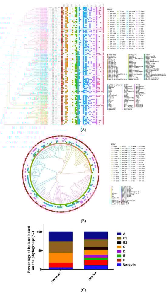The genetic environment analysis of the phylogroups revealed that eight phylogroup terms (A, B1, B2, C, D, E, F, U, cryptic) were found in 158 strains with phylogroup B1 (39.87%; 63/158) and phylogroup A (27.85%; 44/158) being the most common, followed by phylogroup C (15.19%; 24/158), phylogroup F (8.86%; 14/158), phylogroup D (2.53%; 4/158), phylogroup E (1.90%; 3/158), phylogroup B2 (1.27%; 2/158), phylogroup U (1.27%; 2/158), and phylogroup U/cryptic (1.27%; 2/158). Five of these types were found in poultry isolates and eight types in livestock isolates. (Figure 4C).