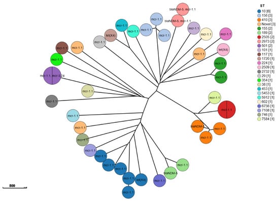 GrapeTree of 42 E. coli strains with super-resistant genes (mcr, blaNDM, and tetX), inferred using the MSTree V2 algorithm based on the cgMLST V1 + Hierarchical Clustering (HierCC) V1 scheme from EnteroBase, colored according to MLST and labeled according to super-resistant genes. scale bar = 500 µm.