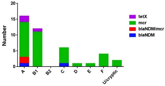Distribution of 42 E. coli strains with genes mcr, blaNDM, and tetX based on phylogroups.