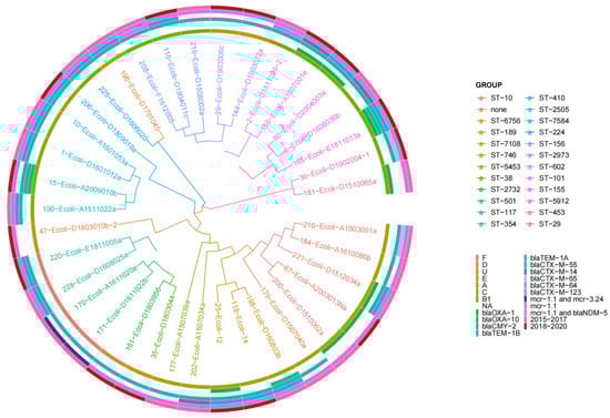 A total of 158 E. coli isolates were isolated from the livers and brains of diseased or dead livestock and poultry received from veterinary clinics in Shandong Province during 2015–2020. These diseased or dead livestock and poultry samples were taken from different farms. Liver and brain samples of livestock and poultry were collected aseptically to reduce microbial contamination. After grinding the samples with PBS, the supernatant was taken by centrifugation and cultured in Orientation Chromogenic Medium (CHROMagar™, Paris, France) overnight at 37 °C. All of the strains were identified using 16S rRNA sequence alignment (Novogene Co. Ltd., Tianjin, China).