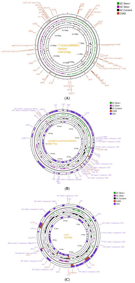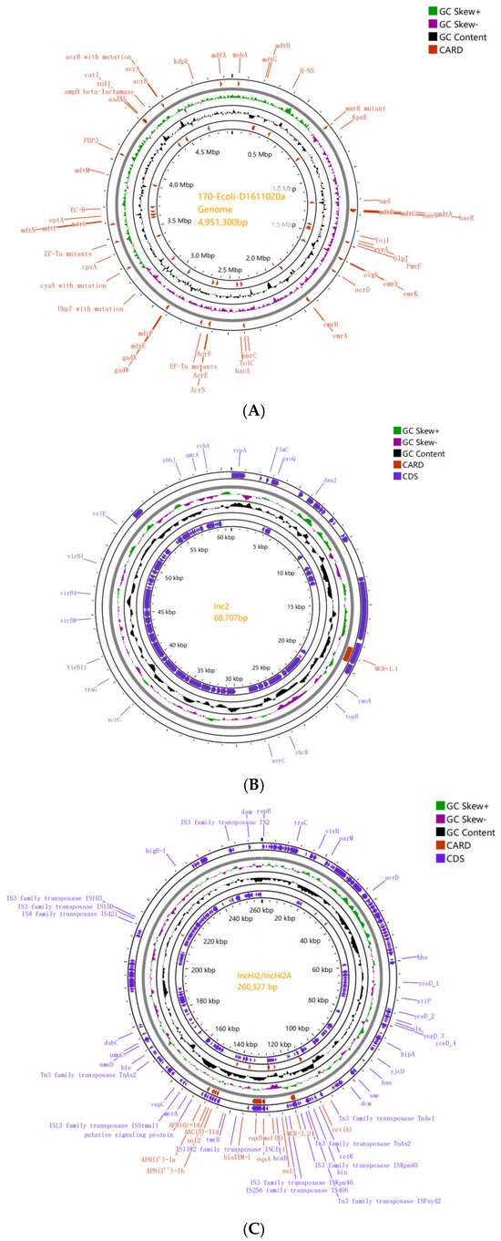 By sequencing, we obtained a chromosome with a size of 4.9 Mb (Figure 9A) and seven circular plasmids in 170-Ecoli-A1611020a (IncI2, IncHI2/IncHI2A, IncFII, IncFIC(FII), IncFIA/IncFII/IncFIB, Col440I, and p011), with sizes ranging from 3.0 kb to 260.3 kb.