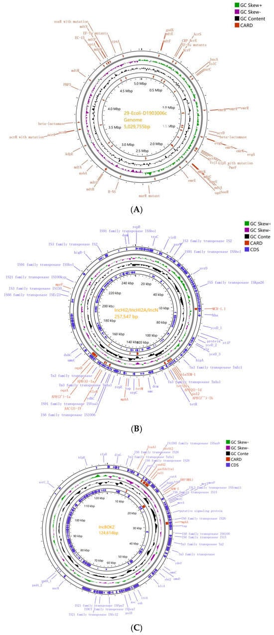 By sequencing, we obtained the chromosome with a size of 5,029 kb (Figure 10A) and four circular plasmids in 29-Ecoli-D1903006c (IncHI2/IncHI2A/IncN, IncBOKZ, IncI/IncFIB(AP001918), and Col440I), with sizes ranging from 2.1 kb to 257.5 kb.