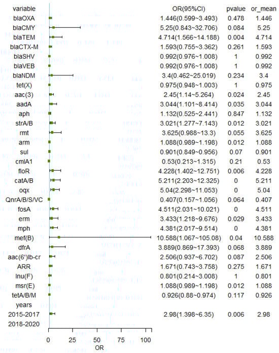 And then, eleven factors (oqx, QnrA/B/S/VC, mph, fosA, cmlA1, blaTEM, catA/B, blaNDM, rmt, strA/B, and lnu(F)) related to mcr genes were screened using a positive correlation threshold > 0.58, a negative correlation threshold < −0.58, and a p value threshold of < 0.05. The results of the correlation network showed that positive correlations existed between mcr and oqx, for example. Additionally, apart from the correlation between mcr genes with other factors, some other correlations were revealed. The results of the correlation network based on the bivariable analysis showed that positive correlations existed between, for example, ARR and blaOXA, blaSHV and tet(X), dfrA and tetA/B/M, sul and tetA/B/M, aadA and drfA, arm and msr(E), etc. (Figure 15).