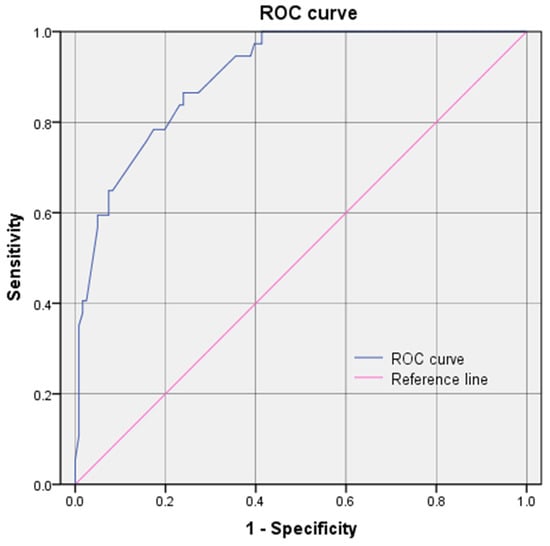 To understand the correlation between resistance genes, binary logistic regression analysis and bivariable analysis were used to co-analyze their relationship with ARGS. Twelve factors (blaTEM, aac(3), aadA, strA/B, floR, catA/B, oqx, fosA, erm, mph, mef(B), and years (2015–2017)) related to mcr genes were screened from thirty two factors using Fisher’s exact test (p value < 0.05 and OR value with a 95% confidence interval >1 or < 1) (Figure 12). And seven risk factors (blaTEM, strA/B, floR, catA/B, years, mph, and aadA) were confirmed (p < 0.05) to create the logistic model followed by binary logistic regression analysis (backward elimination). The ROC curve for the baseline model from the study showed an overall AUC of 0.903 (lower limit of 0.854 to an upper limit of 0.952) with a 95% confidence band (Figure 13). ROC = 2.848 × X1 + 2.928 × X2 + 2.030 × X3 + 2.488 × X4 + 1.326 × X5 + 1.208 × X6 + 1.550 × X7 − 9.984 (X1: floR; X2: catA/B; X3: blaTEM; X4: Years (2015–2017); X5: strA/B; X6: mph; X7: aadA).