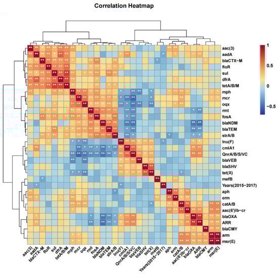 Heatmap and cluster analysis for correlation between resistance gene-related factors using the Euclidean and Ward.D of hcluster (hierarchical clustering) method based on Kendall (positive correlation threshold > 0.5, negative correlation threshold < −0.5, and threshold of p value < 0.01) (* p < 0.05; ** p < 0.01).