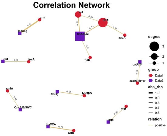 Cluster network analysis for the correlation between resistance genes. The data were screened using a positive correlation threshold > 0.58, a negative correlation threshold < −0.58, and a p value threshold of < 0.05. Data 1 and data 2 of the group are the resistance genes used for the pairwise correlation analysis.